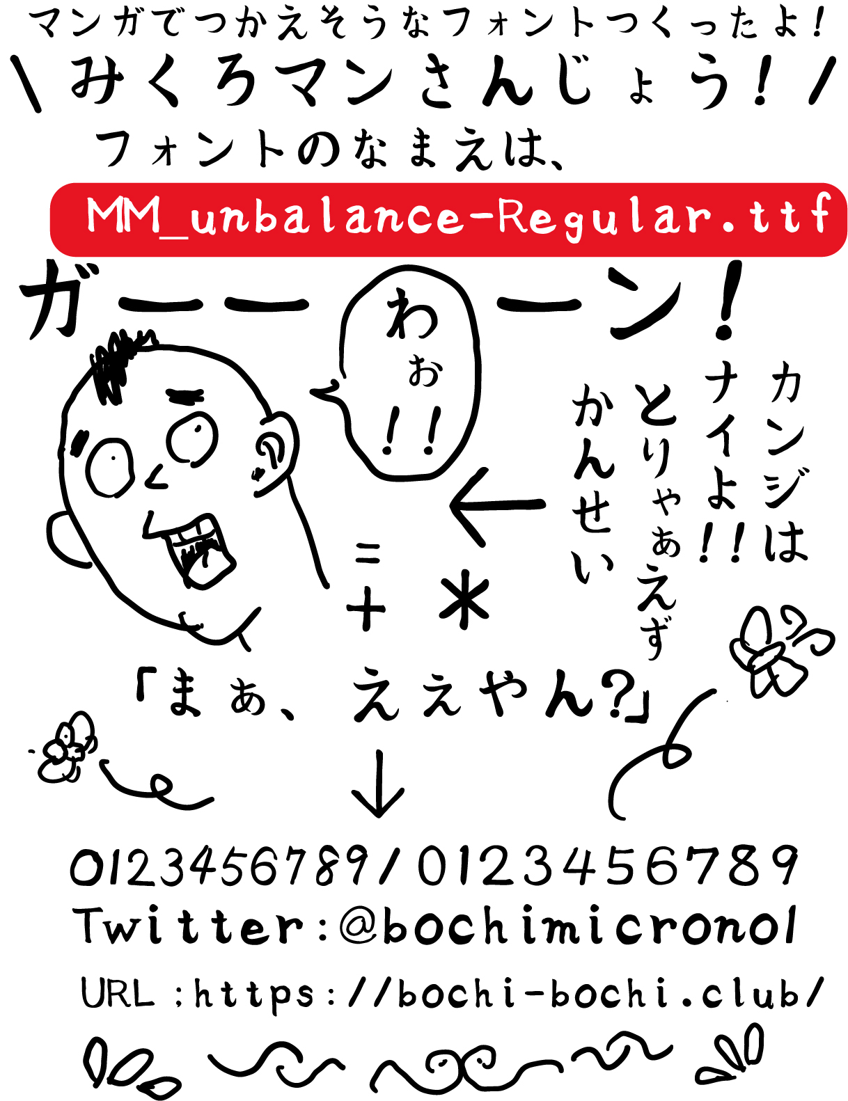 ◆このフォントを使用することで起こったいかなる損害に対しても制作者であるみくろマン及びぼちぼち倶楽部は